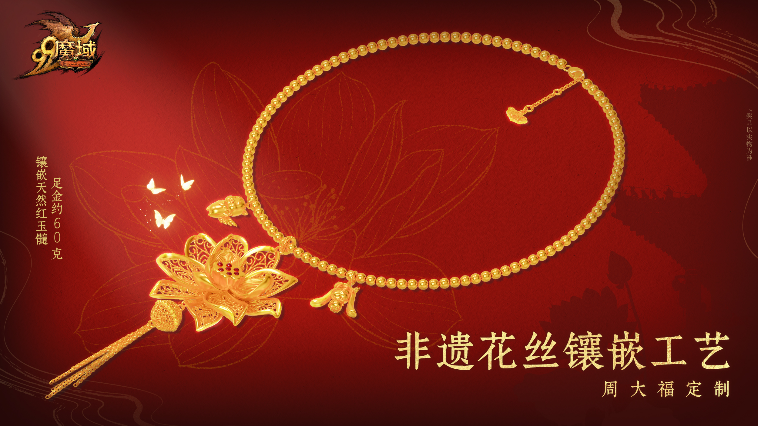 魔域特别定制的周大福【圣莲花丝 魔域鎏华】花丝镶嵌非遗足金项链,以“圣莲”为魂,60克黄金淬炼为发丝般的金线,掐出莲瓣的婉转弧度,经掐、填、攒、焊、堆等超百道工序,如流云般堆垒编织出圣莲的玲珑瓣影,每道金纹都藏着薄如蝉翼的帝王审美,在方寸之间呈现极致繁复的宫廷御用工艺。999足金熔铸的莲蕊间,天然红玉髓如焰跳动,恰似花魁女神夺目风华;垂坠的流苏轻晃,恍若圣莲滴落的千年朝露,在颈间晕开诗意涟漪。这不仅是一件价值超10万元的定制珠宝,更是魔域与非遗的跨时空对话,将倾世之美刻入金丝脉络。