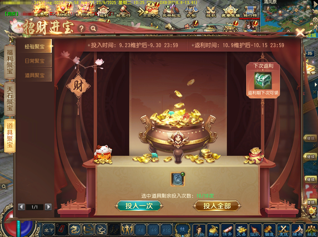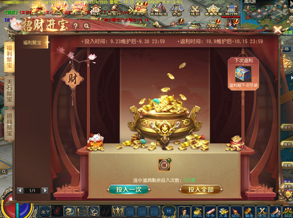 4、10月9日0:00至10月15日23:59为返利期间,大侠可在此期间领取之前投入聚宝盆的返利。