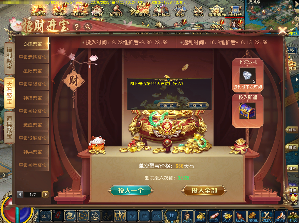 3、9月23日0:00至9月30日23:59为投入期间,各位大侠可选择福利聚宝、天石聚宝和道具聚宝三种类型聚宝盆进行道具或天石投入。投入天石聚宝盆,在返利期即可领取7次返利