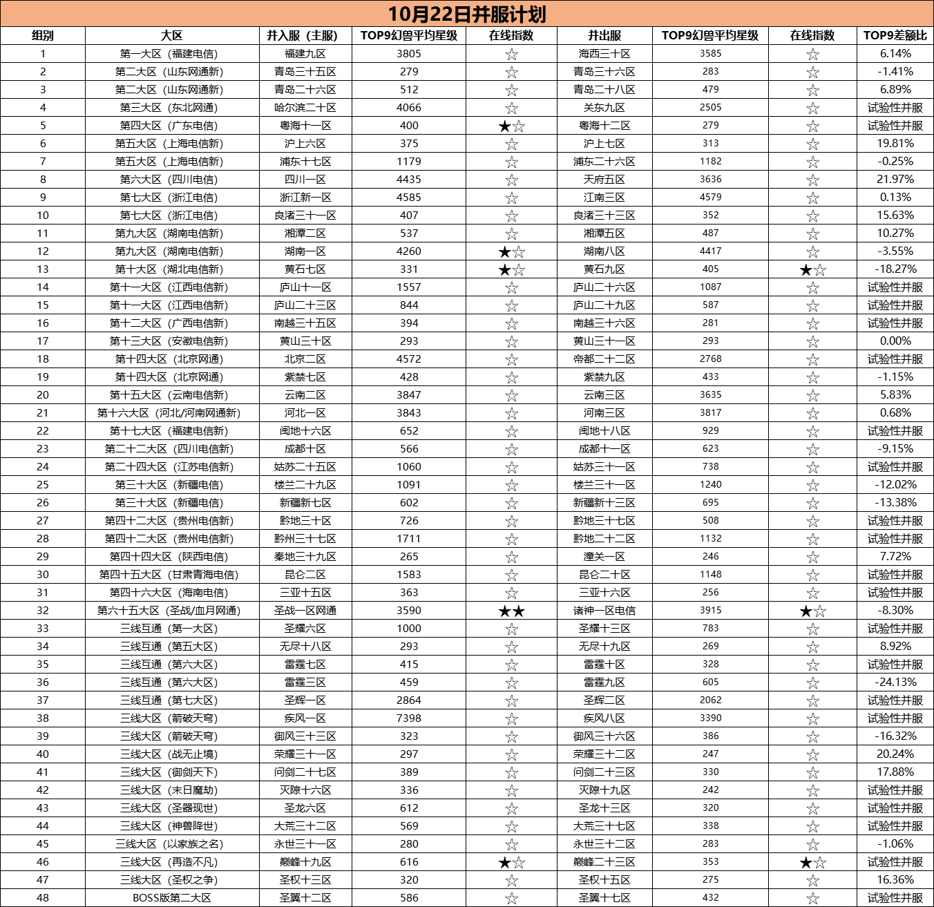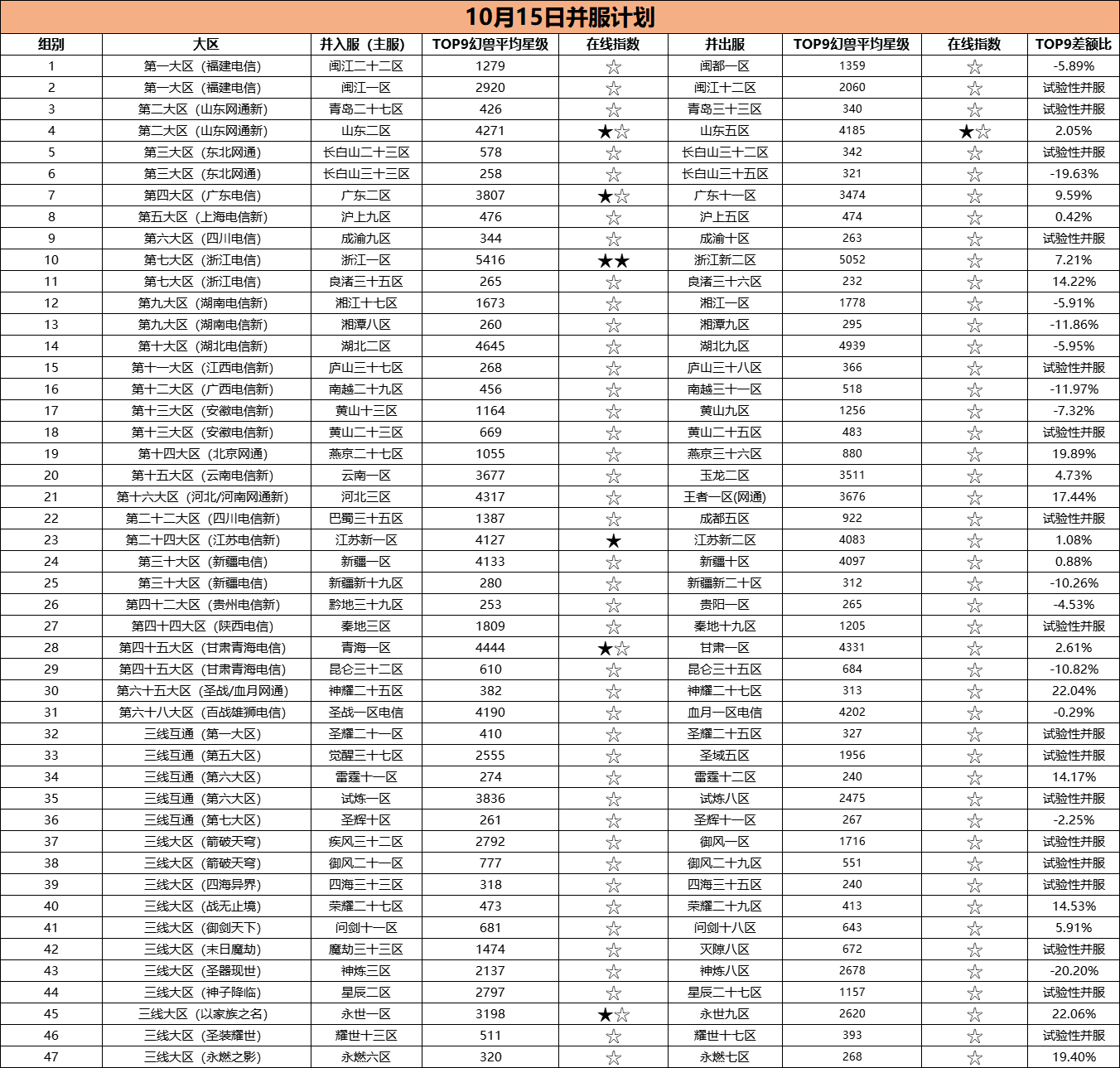 注:本月为使用TOP9幻兽平均星级差距值筛选服务器进行试验性并服,后续将根据本次情况进行调整。同时,官方将视服务器具体实际情况进行选择性并服。