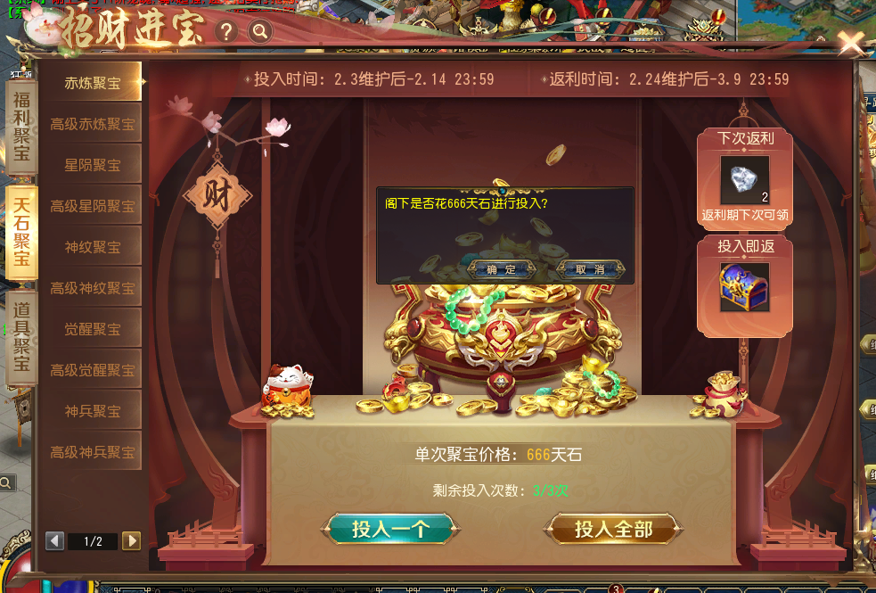 3、2月3日0:00至2月14日23:59为投入期间,各位大侠可选择福利聚宝、天石聚宝和道具聚宝三种类型聚宝盆进行道具或天石投入。投入天石聚宝盆,在返利期即可领取7次返利