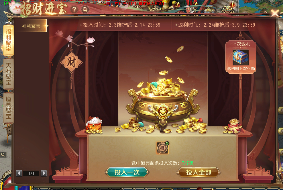 4、2月24日0:00至3月9日23:59为返利期间,大侠可在此期间领取之前投入聚宝盆的返利。