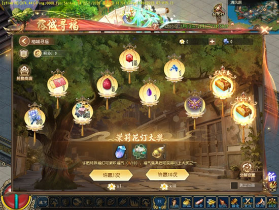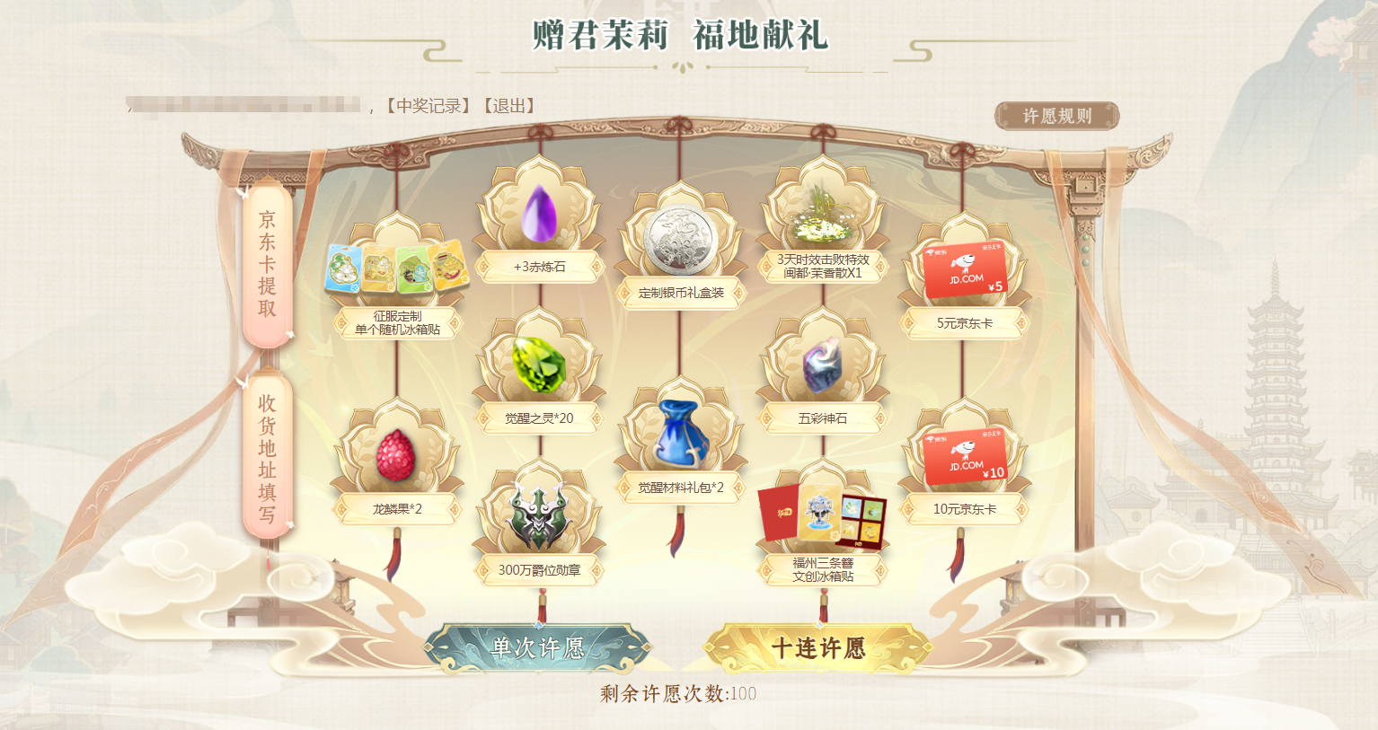 线上部分,阁下可前往苏仪处求其福签,领取幸运好礼。同时每日寻找榕树下的苏仪进行祈福签到可获得茉莉福签,使用福签可获得赠君茉莉环节许愿次数。