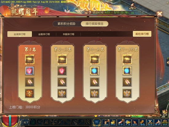 2、累计积分达到30000以上,方可参与全服/全球排行榜
